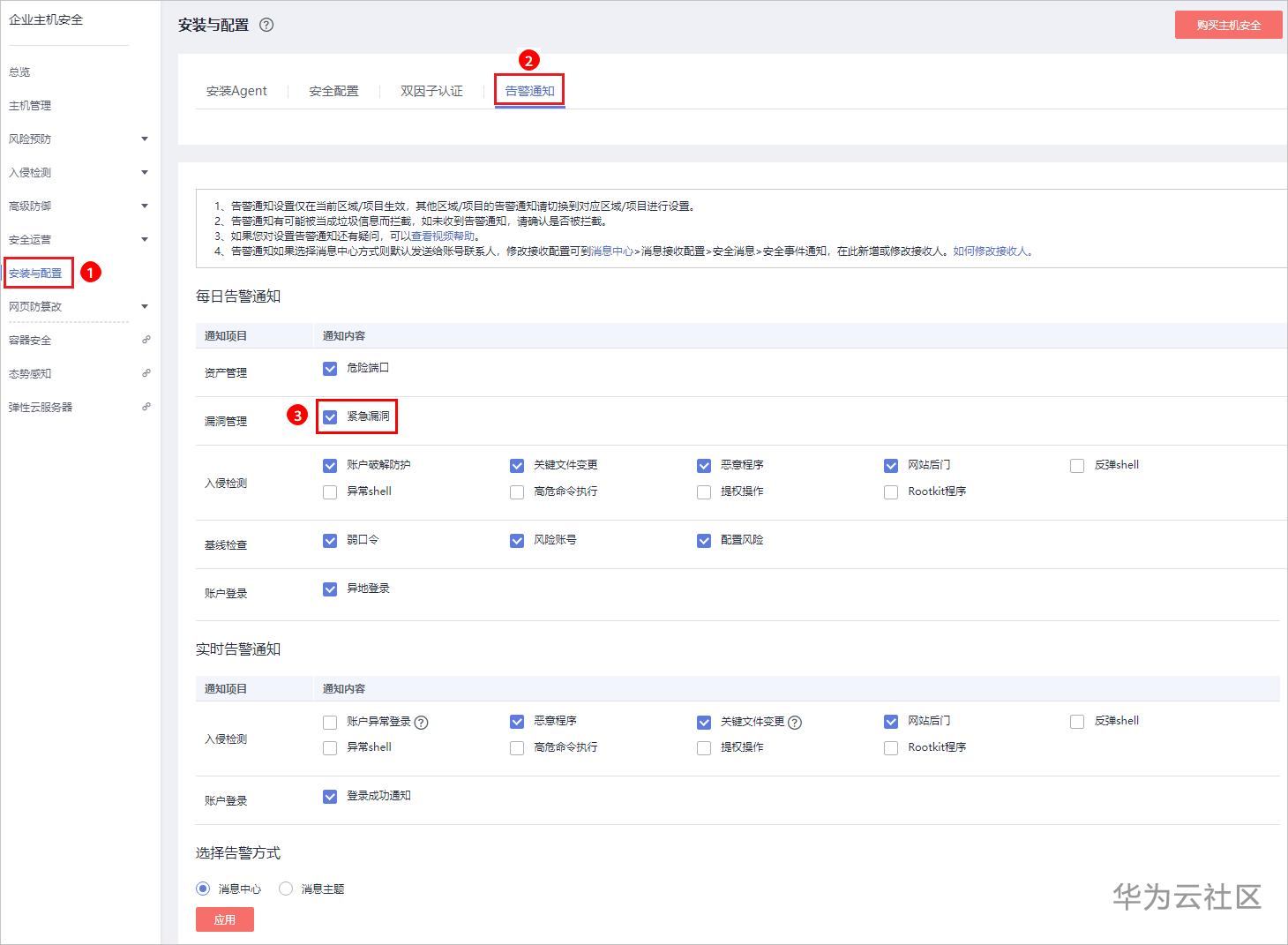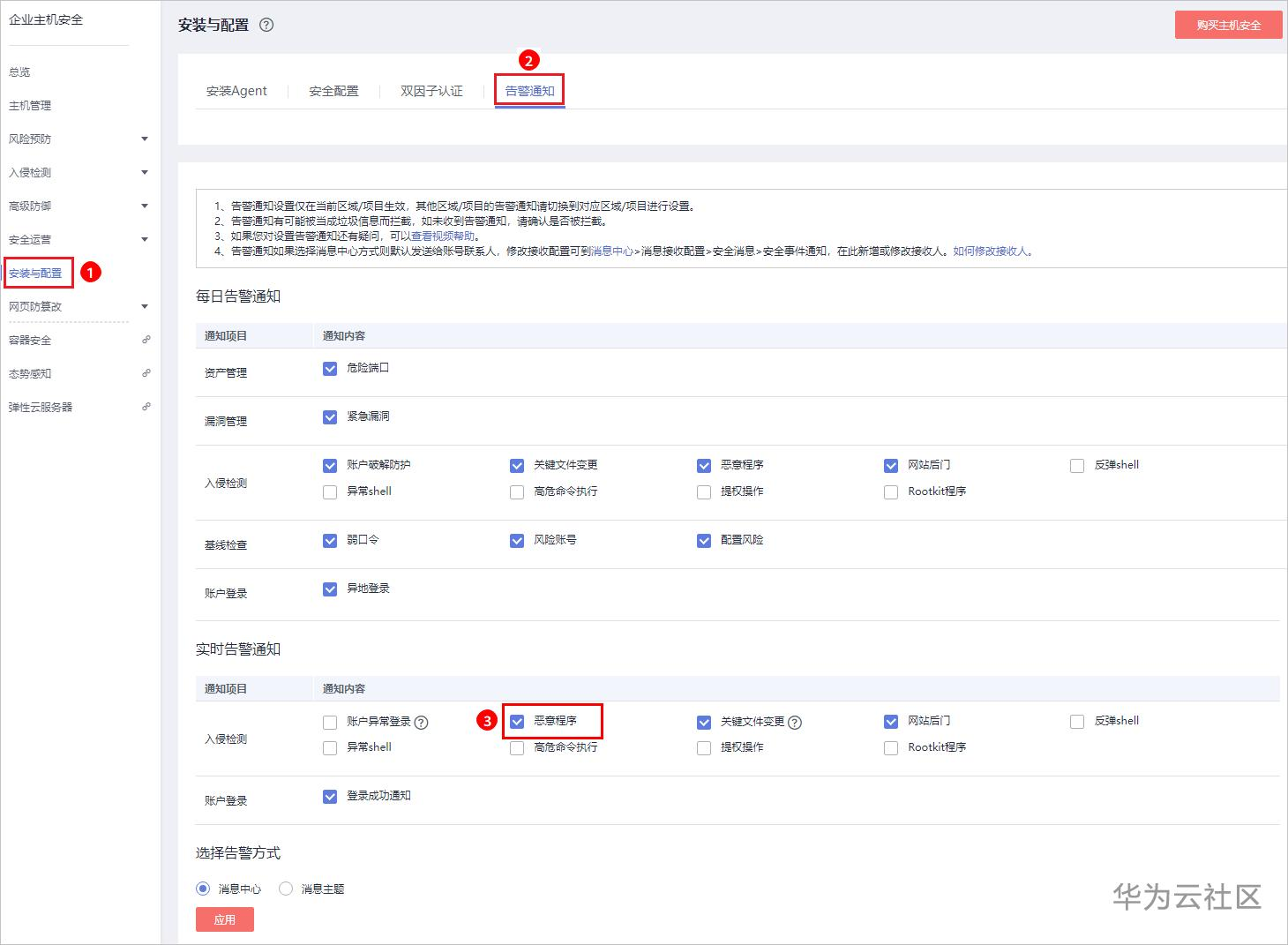 步骤 3 选择“安装与配置 > 告警通知”页面,勾选“恶意程序”实时告警通知,一旦检测出恶意程序,您将会收到告警通知。