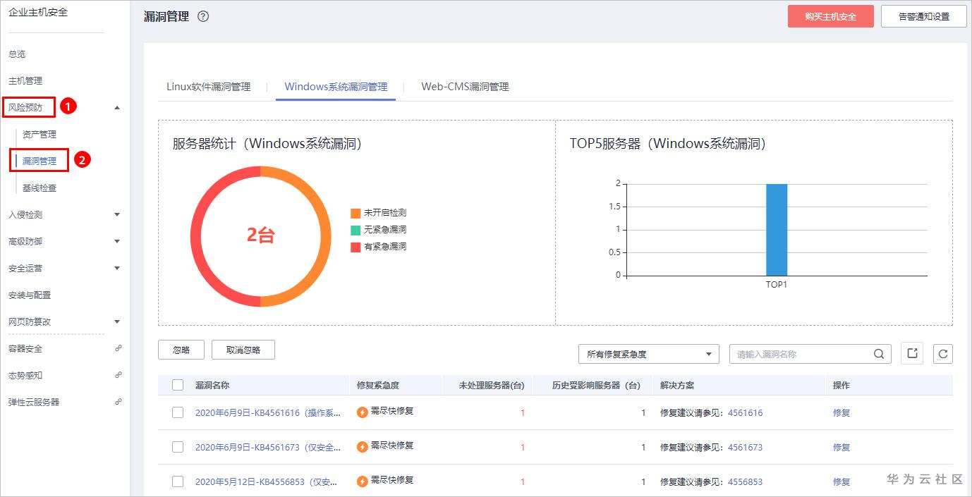 步骤 1 选择“安全 > 企业主机安全”,进入“漏洞管理”页面。