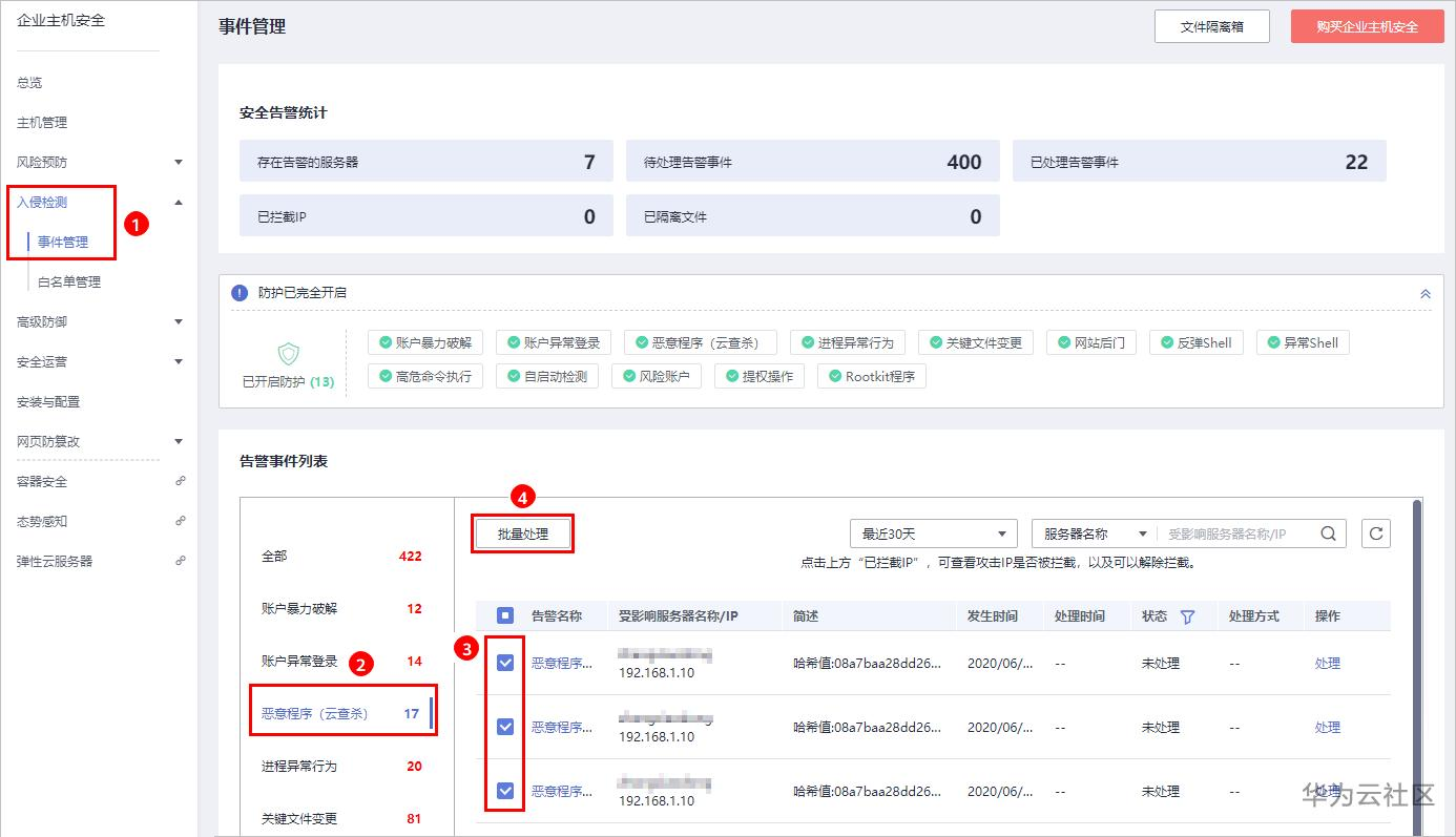 步骤 1 选择“安全 > 企业主机安全”,进入“事件管理”页面,查看并处理“恶意程序(云查杀)”告警事件。