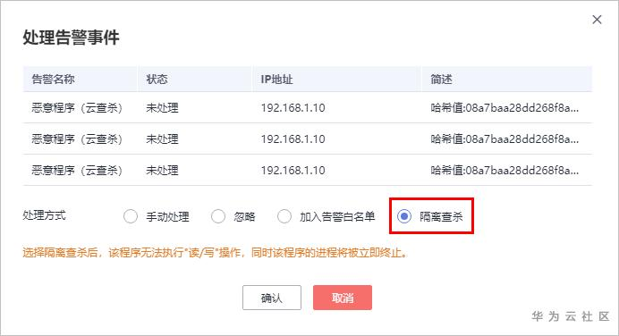步骤 2 选择“隔离查杀”,一键查杀勒索病毒。选择隔离查杀后,该程序无法执行“读/写”操作,同时该程序的进程将被立即终止。HSS将程序或者进程的源文件加入文件隔离箱,被隔离的文件不会对主机造成威胁。