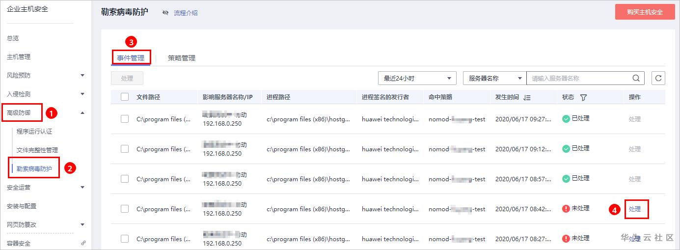 步骤 1 进入“勒索病毒防护”页面,在“事件管理”列表中,您可查看并处理告警事件。