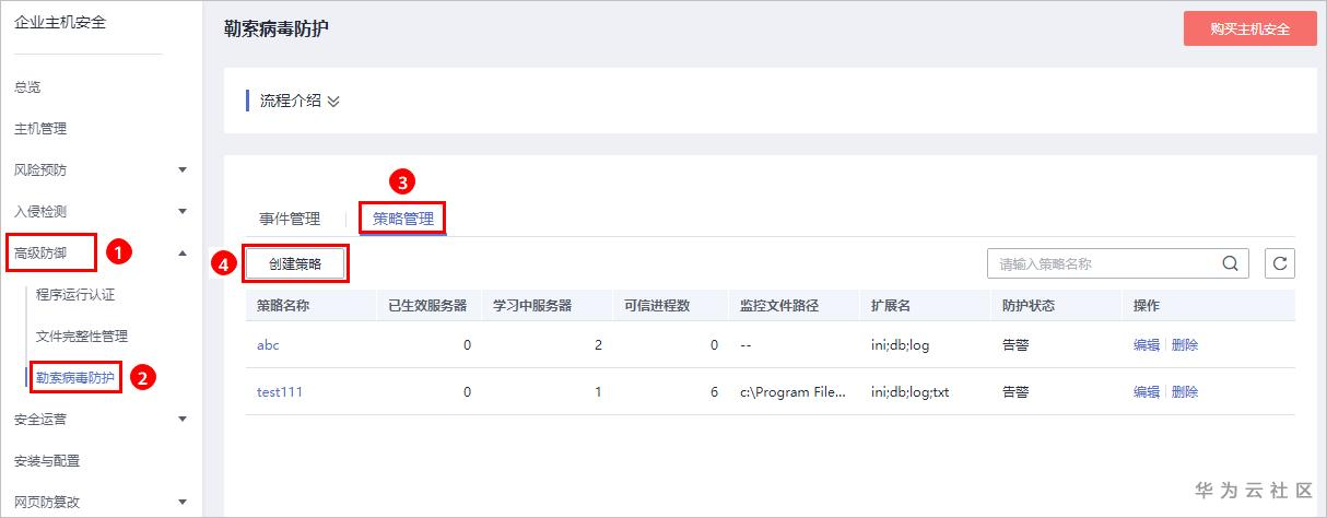 步骤 1 选择“安全 > 企业主机安全”,进入“勒索病毒防护”页面,选择“策略管理”,创建智能学习策略。