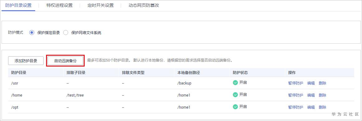 步骤 3 启动远端备份。HSS默认会将防护目录下的文件备份在“添加防护目录”时添加的本地备份路径下,为防止备份在本地的文件被攻击者破坏,请您启用远端备份功能。