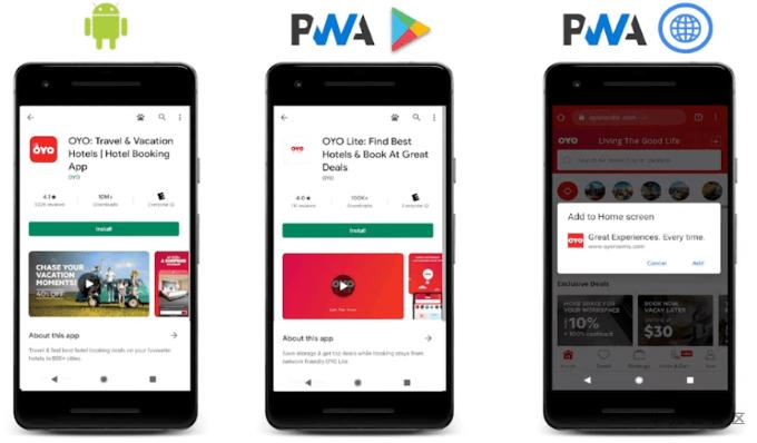 这里举了两个例子,一个是巴西的一家房地产公司重用代码库在互联网和游戏商店中同时为用户提供下载服务;另一个例子是拥有超大用户量的印度最大酒店公司之一的OYO,它是用了提供不同版本来满足不同用户下载需要的方法。对于设备较好的用户推荐下载原生app;第二种是将网页应用上传到应用商店,这种方式较为轻量,适用于用户设备较差的情况;第三种是直接点击链接进入网页,则可直接从主屏幕安装。