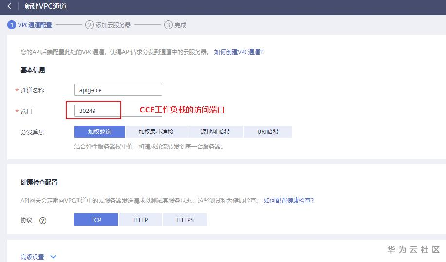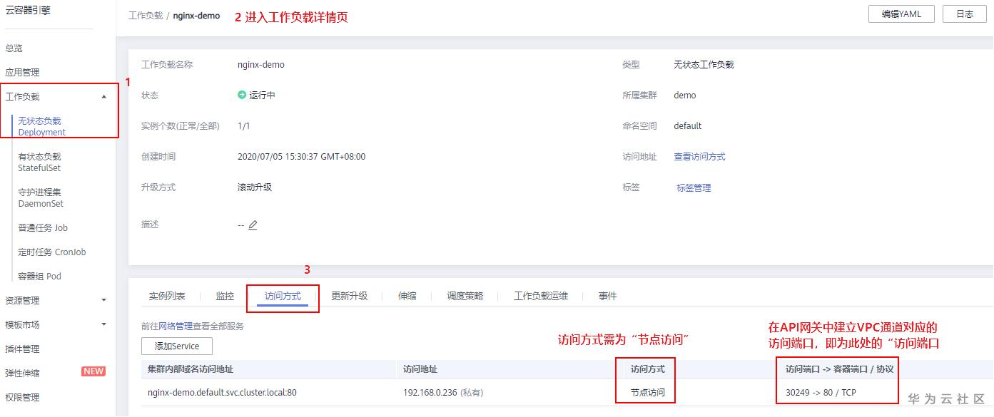 在通过API网关将容器的工作负载对外开放前,需要在CCE服务控制台获取如下图所示信息,创建好集群和工作负载。注意工作负载的访问方式,需配置为“节点访问”。