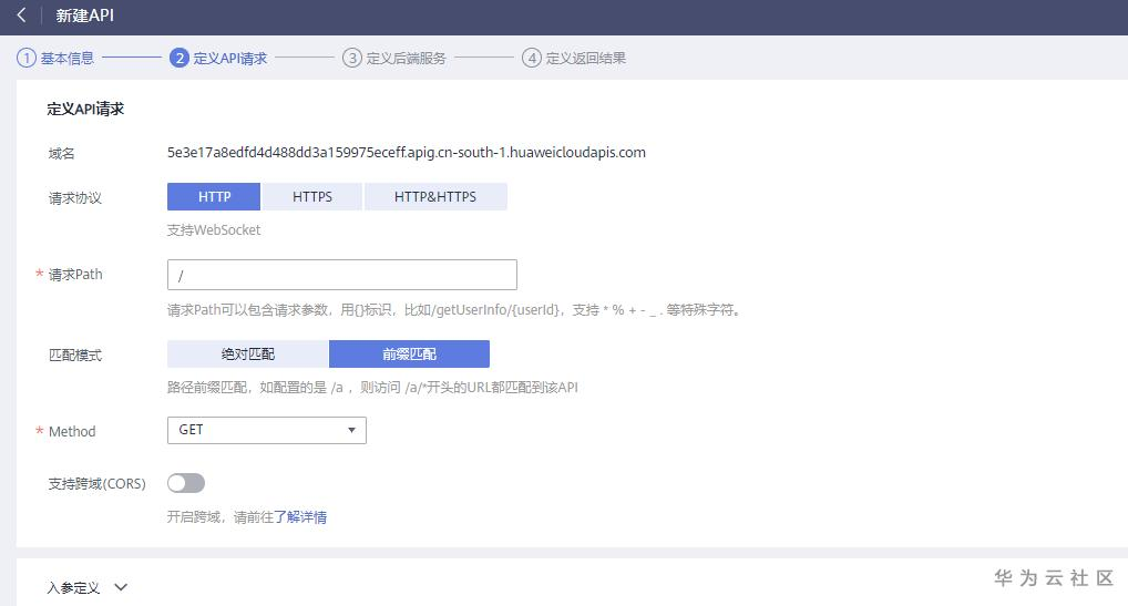在“定义API请求”界面,输入如下图所示信息。