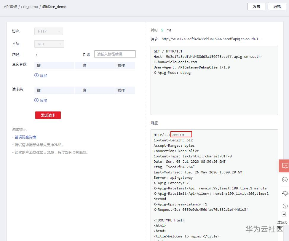 3、调试API。返回200,表示调用成功。