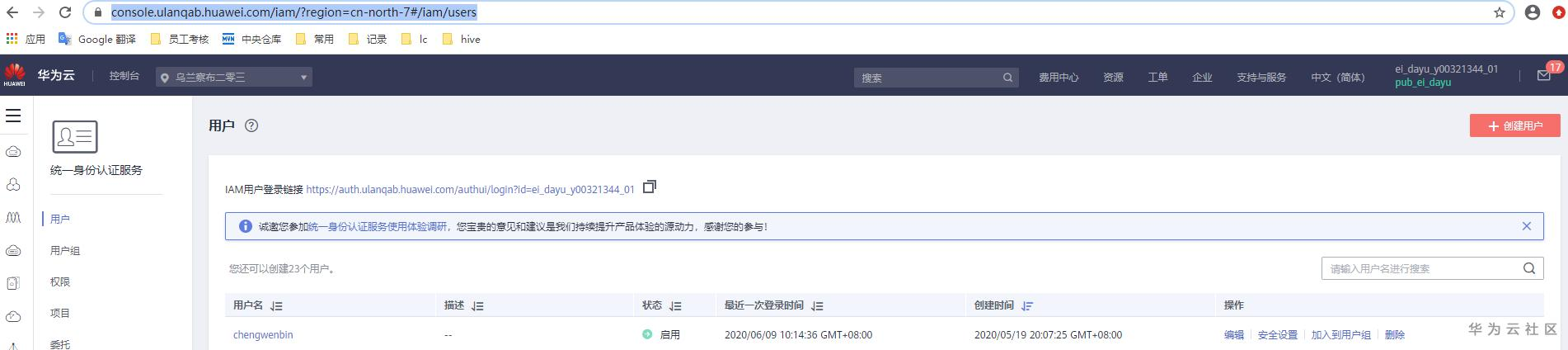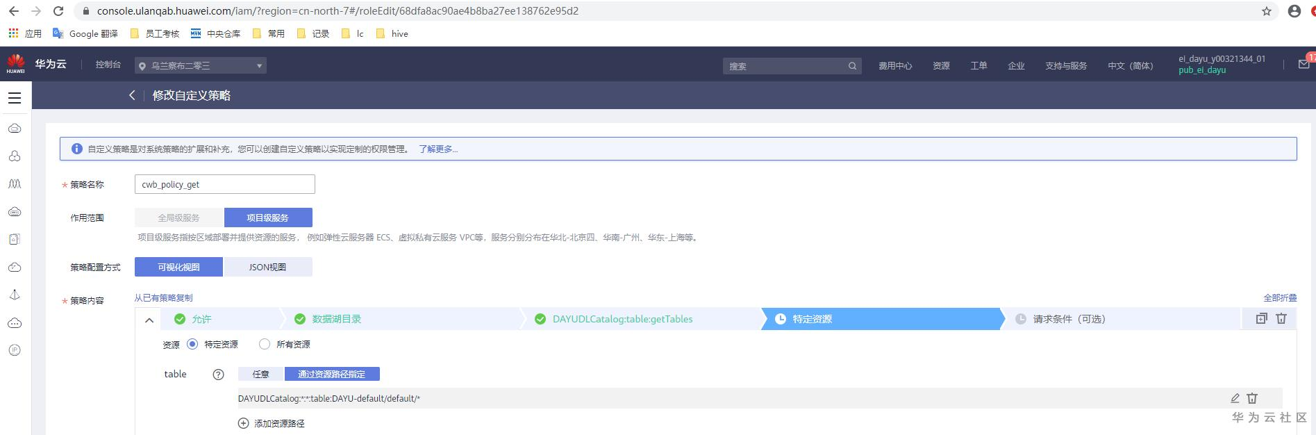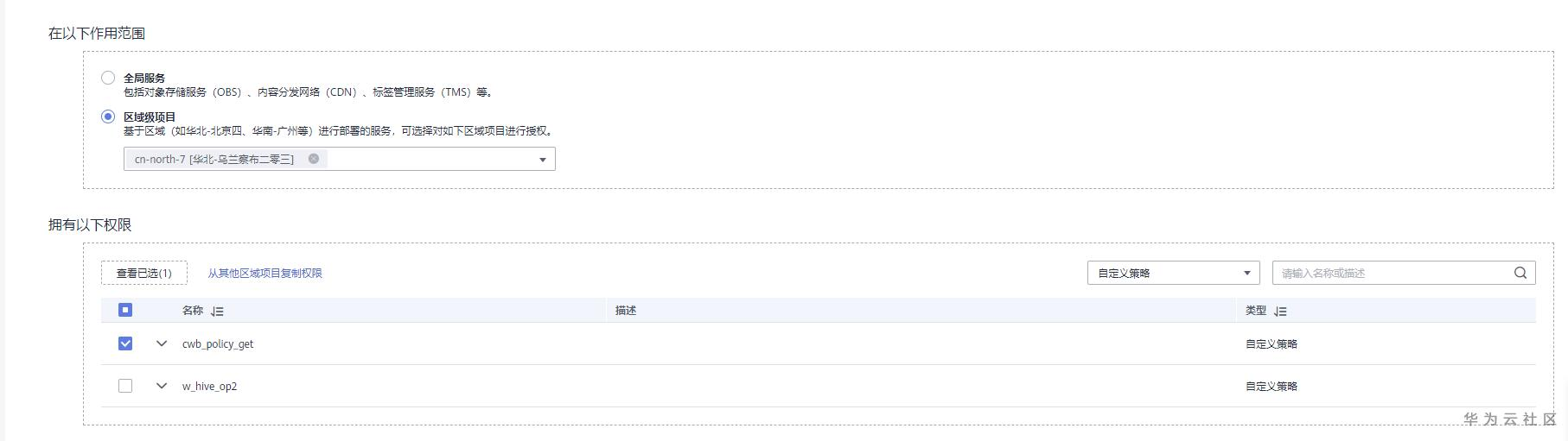 配置权限-->区域级项目--> cn-north-7[华为-乌兰察布二零三]-->选择自定义策略--> 确定