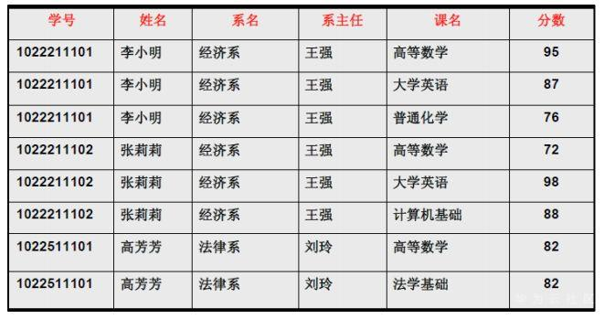 非主属性有四个:姓名、系名、系主任、分数