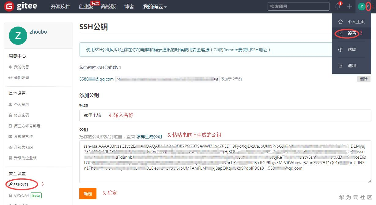 3)在自己的gitee上添加本机电脑生成的公钥(关键步骤,必须完成)