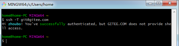 在Git Bash输入以下指令,请对比输出信息,提示You’ve successfully authenticated即为成功,你当前的电脑已经可以通过公钥访问你的gitee了