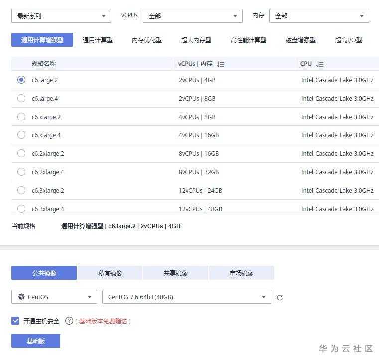 考虑性价比,云主机可以选择华为云通用计算增强型C6s(2020年)机型,适用于对计算和网络性能和稳定性要求较高的场景。
