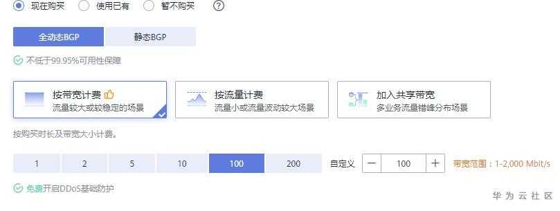 注意,在选用公网带宽时,有按流量计费和按带宽计费两种模式。模式的选择对您的费用支出会有较大影响,如果您的网络利用率很高,带宽占用较高而且稳定,譬如说经常会把100Mpbs带宽占满,那您要选择按带宽计费。如果您的网络利用率不是很高,偶尔会有较大并发需求,譬如1个月有几次大并发的直播,那您一定要选择按流量计费,这样最经济。
