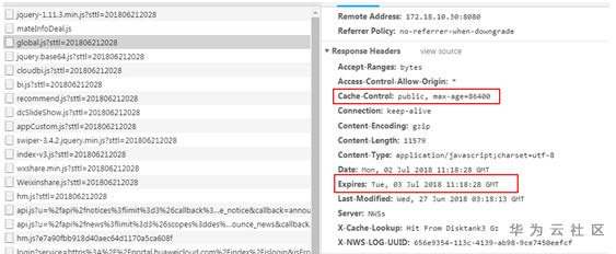 例如:下图(华为云官网首页)中,文件global.js的Cache-Control指定的缓存失效时间max-age为86400s(1天):