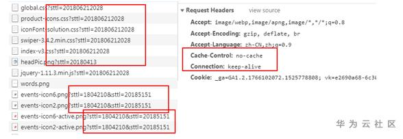 上图描述的是可缓存文件的缓存策略。但是,网页中还有很多文件,比如global.js、global.css等,更新频率较快,如果一直使用本地缓存可能会影响页面的正确性。因此,在引用这部分文件时,会在文件后添加个版本号,用以刷新缓存,以此确保本地资源的时效性,添加版本号的目的是为了强制要求文件每次加载重新向服务端请求。如下,左图给出了部分文件的版本号后缀。这部分文件在浏览器重新加载后,请求报文的头文件,Request Header的Cache-control值为no-cache,即无缓存,重新请求数据。如下右图所示:
