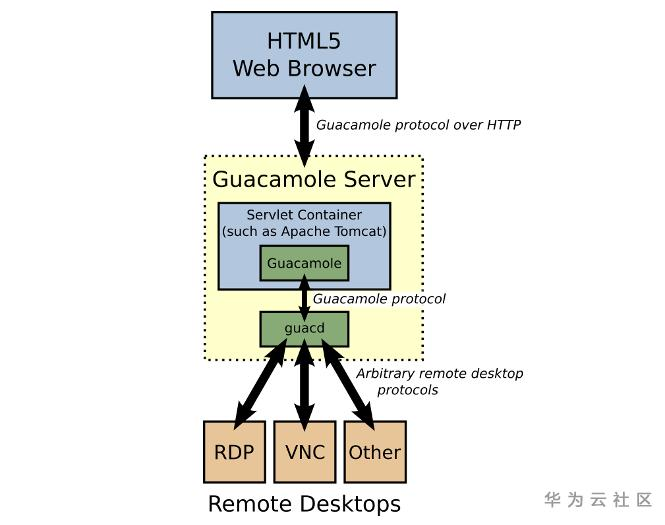 当用户通过浏览器连接一个Guacamole服务器时,Guacamole client组件通过内置于Guacamole 服务器的webserver提供给用户(servered to users by a webserver within the Guacamole server)。继而这个client使用Guacamole协议通过HTTP连接回Guacamole服务器。