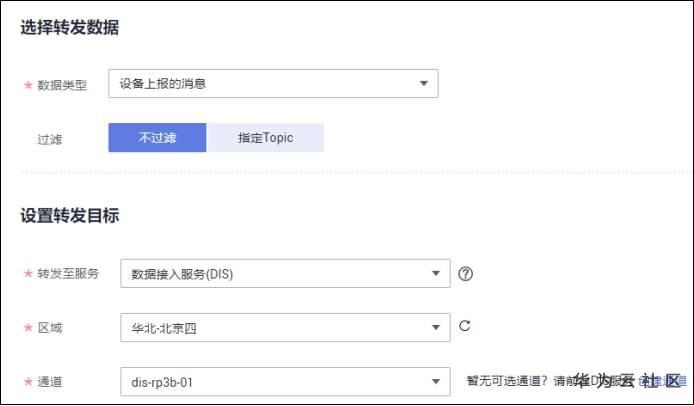 上述配置是将,设备上报的信息转发到数据接入服务。如果没有建立数据服务,需要先建立号数据服务DIS。具体的建立方法可以参考如下的DIS用户指南。DIS开通时候会收费的,试用或者开发初期可以按照按需收费的方式购买及建立。