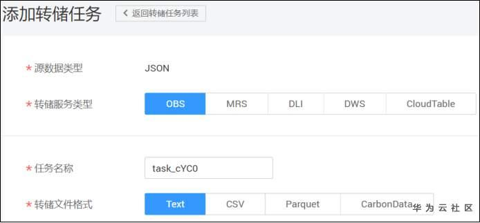 DIS中可以将数据转储到OBS,MRS,DLI,DWS,CloudTable。我们以OBS存储为例,配置DIS转发到OBS存储,具体的配置方法可以参考DIS用户手册。在配置转储任务时,注意如下,转存类型选择OBS,转储文件格式选择Text。也可以根据需要选择合适的文件格式。