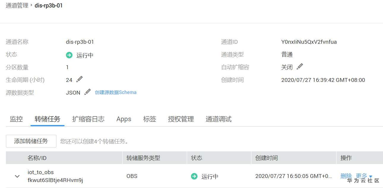 配置好的转储任务,可以在通道管理中看到示例的dis-rp3b-01通道中的转储任务iot_to_obs的状态正在运行中。