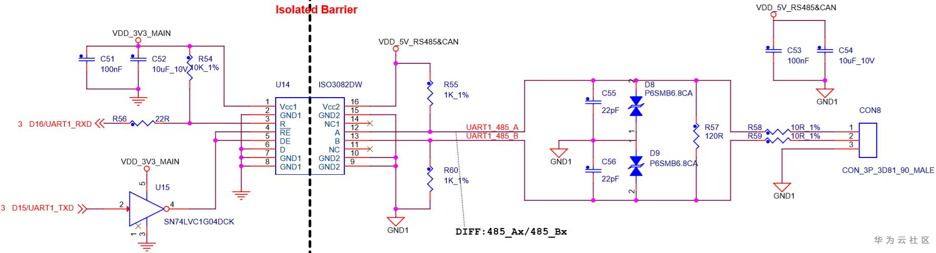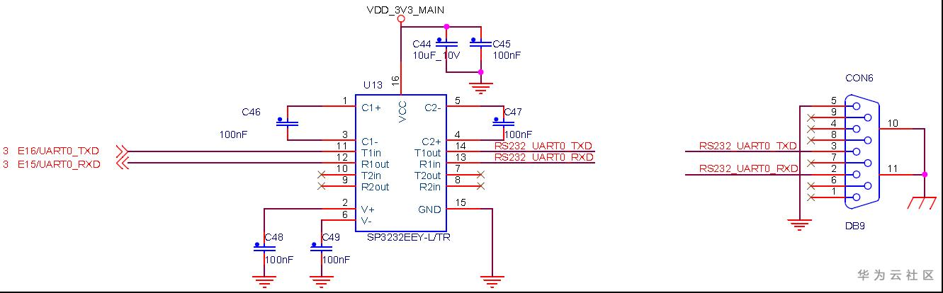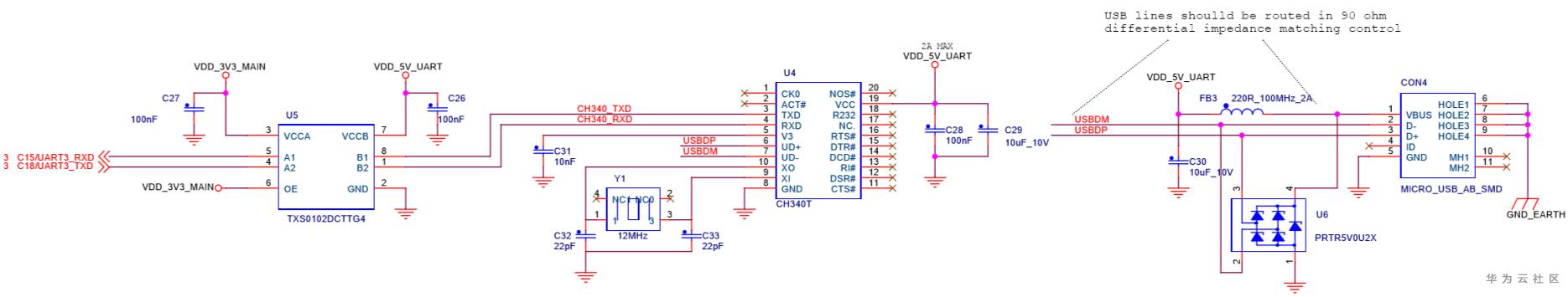 开发板上共引出了3个串口,分别为CON4、CON6、CON8,其中CON4为Micro USB调试串口(UART3)、CON6为RS232串口(UART0)、CON8为RS485串口(UART1)。其硬件位置及原理图如下图所示: