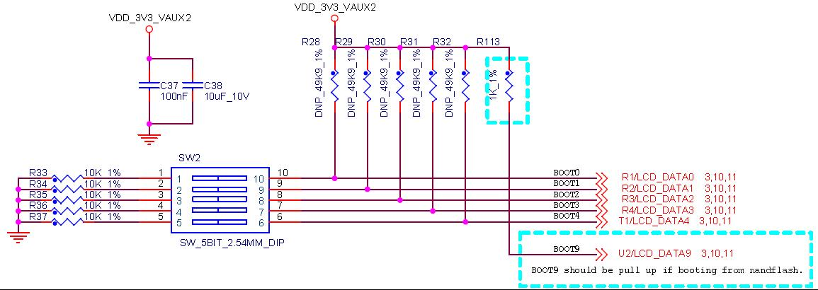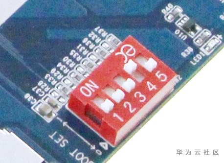 SW2设有5位拨码开关,如下图方向放置,拨码向ON方向拨动为1,向ON的相反方向拨动为0,其硬件位置及原理图如下图所示: