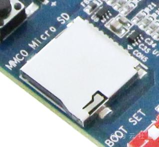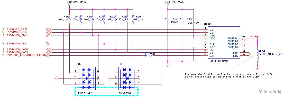 Micro SD卡接口,主要用于外接大容量数据存储,其硬件位置及原理图如下图所示: