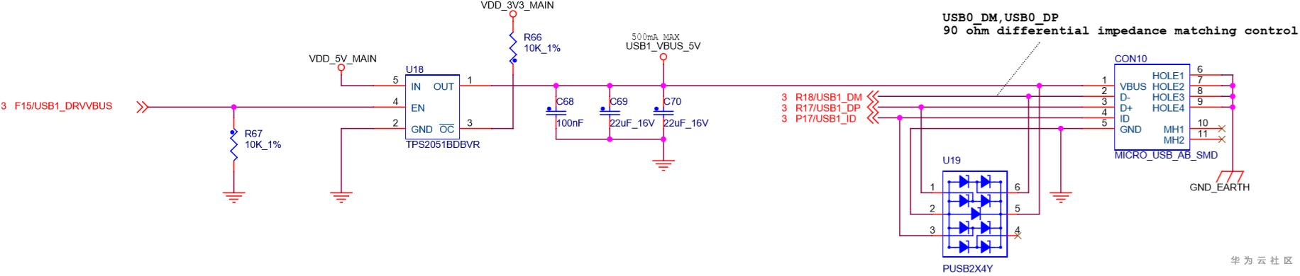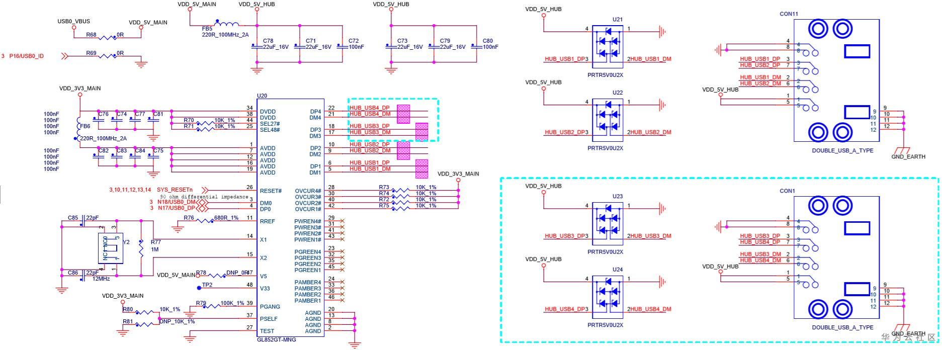 CON1和CON11是双层的USB HOST 2.0接口,应用于各种不同的移动设备间的连接,进行数据交换,传输速度高达480Mbps。可以接USB摄像头、USB键盘、USB鼠标、U盘等常见的USB外设。其硬件位置及原理图如下图所示: