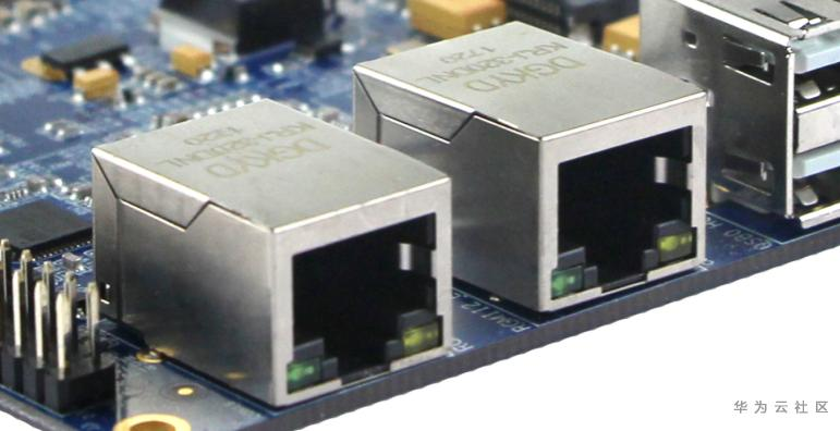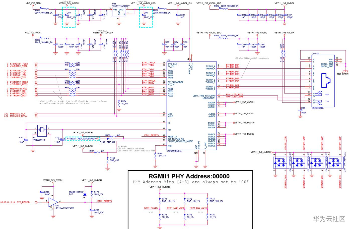 开发板配置了两个RGMII千兆以太网口CON18和CON19,采用了KSZ9031RNXIA网络芯片,自适应10/100/1000M网络,RJ45连接头内部已经包含了耦合线圈,因此不必另接网络变压器,使用普通的直连网线即可连接开发板至路由器或者交换机。其硬件位置及原理图如下图所示: