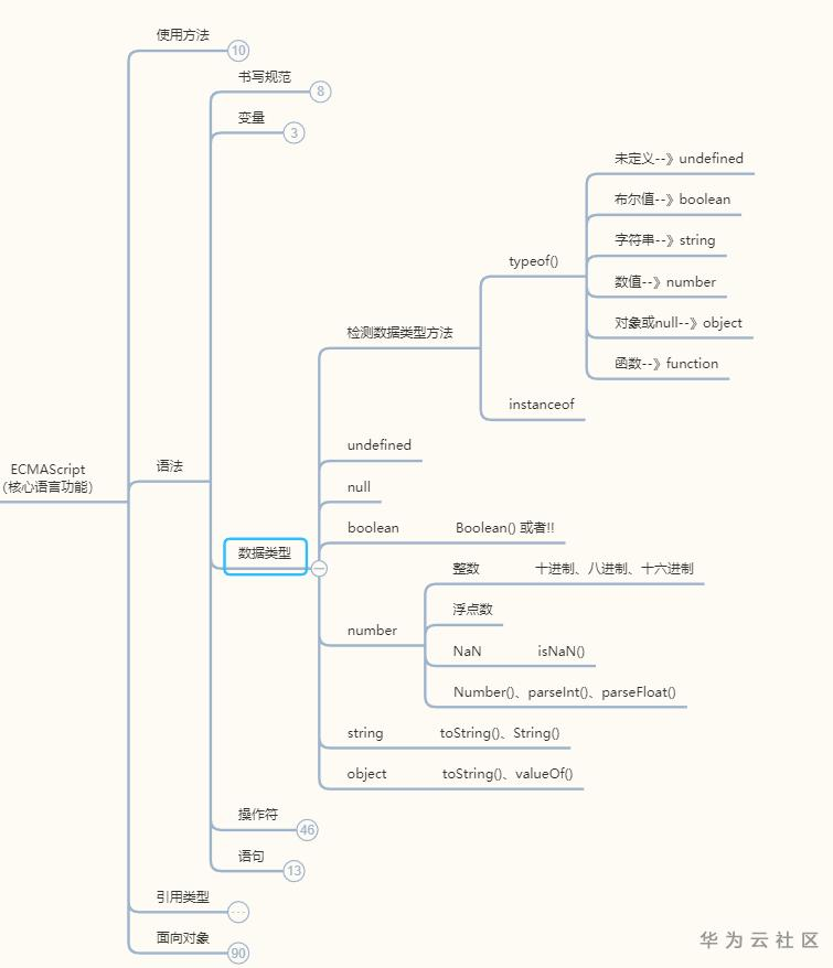 简单数据类型,我们就说完啦,下面说下检测数据类型的方法,图中可见,有两种,typeof和instanceof,这两个呢,确切来说是操作符,你使用的时候,可以直接用,也可以在操作符后面带个括号,看起来清晰一些。typeof各种数据类型的返回值,我在导图中,都标注出来啦,可以简单看下使用方法哦: