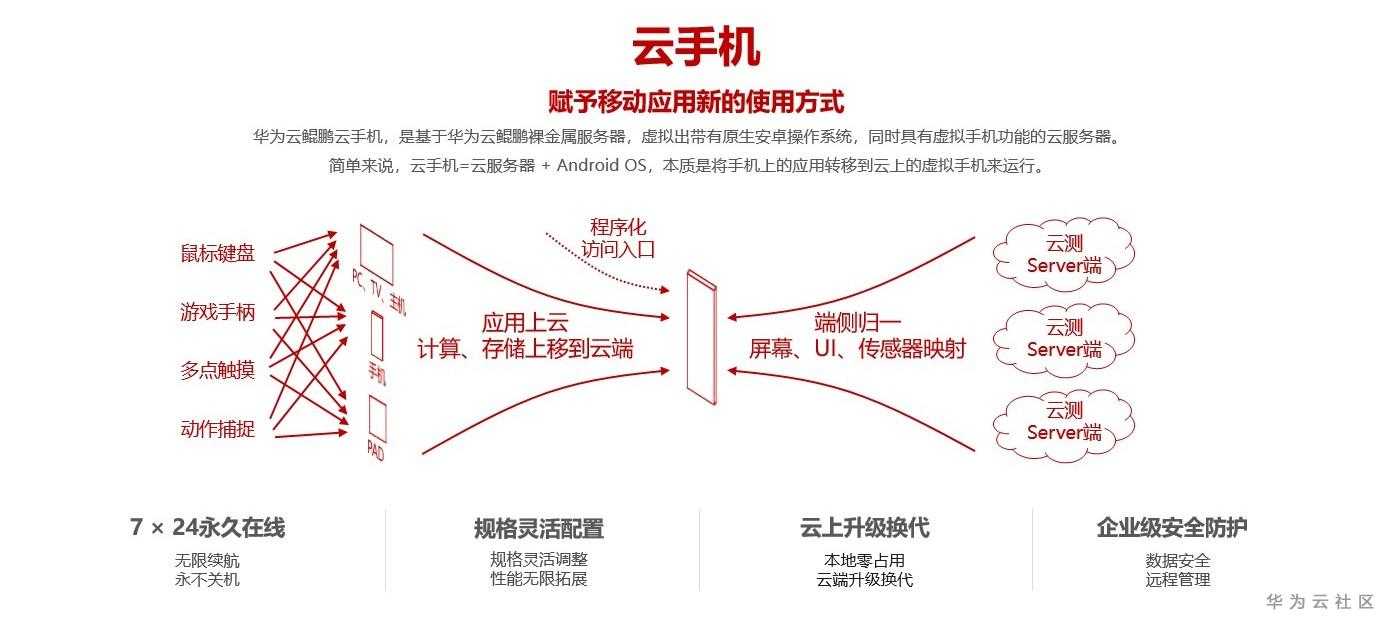 华为云云手机,是基于华为云裸金属服务器虚拟出的带有原生安卓操作系统,同时具有虚拟手机功能的云服务器。