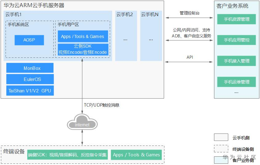 产品结构:云手机产品分三部分,云手机侧、终端设备侧以及客户业务侧