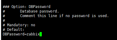 vi /etc/zabbix/zabbix_server.conf #将文件内容做如下修改DBPassword=password
