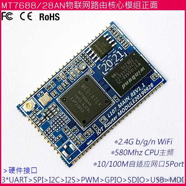 BOJINGnet——MT7688模块整合1T1R 802.11 b/g/n 无线传输功能,采用MIPS24KEc/580MHz中央处理器(CPU)、5端口高速以太网络交换器或是单端口超高速以太网络PHY,以及USB 2.0主控制器、PCIe、SD-XC、I2S/PCM和多种适用慢速的I/O装设备接口。也就是说MT7688模块为单天线,有1个IPEX座,150M速率,相对于MT7628模块来说:MT7688模块功耗比较低,价格也比较有优势。BOJINGnet在模块上开发烧录有稳定成熟的固件:有线转WiFi、4G转WiFi路由器、工业级4GDTU、吸顶AP、4G路由器、无线音箱、无线存储扩容、无线图传、数据透传等等,可通过模块直接使用固件功能,MT7688模块通过FCC CE RoHs等相关认证。
