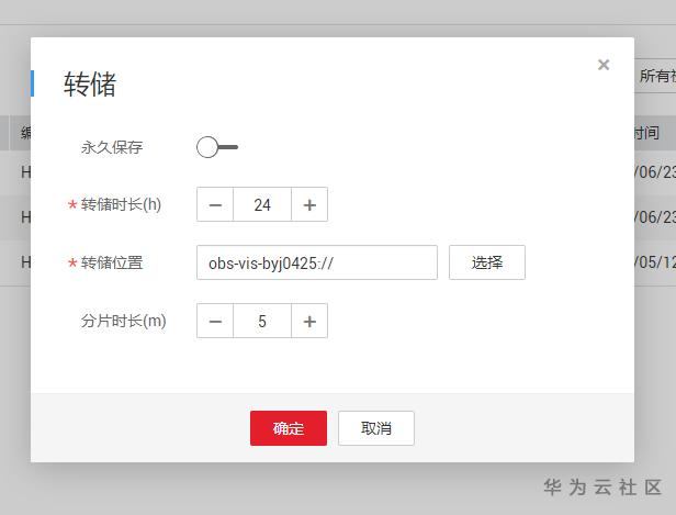 3、点击视频流操作栏的开始转储,根据需要填写转储时长或者选择永久保存,选择步骤一创建的OBS桶和路径,分片时长默认为5分钟,可根据需要调整该值。确认开始转储后,该视频流接入的视频就会存储至OBS相应存储位置。