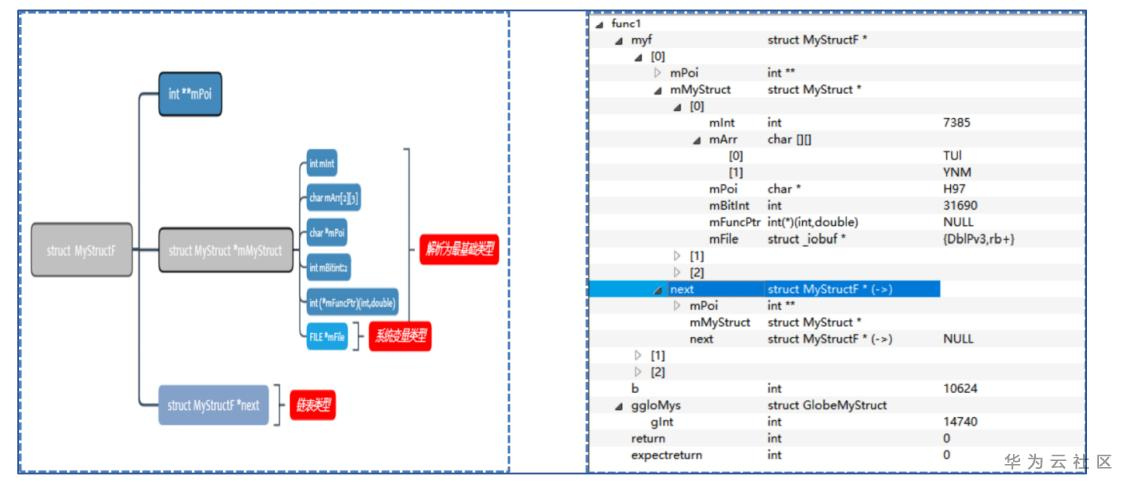 Wings可以对程序参数进行深度解析,比如c++类、模板类、数组、结构体、指针、链表以及任意复杂结构的层级嵌套,同时对于面向对象的程序特性以及常用的容器库,能够完美识别和支持。对于一些void*、函数指针、模板类等无法直接静态分析进行类型确定的特殊情况,均有基于人工智能的程序分析辅助进行类型确定。