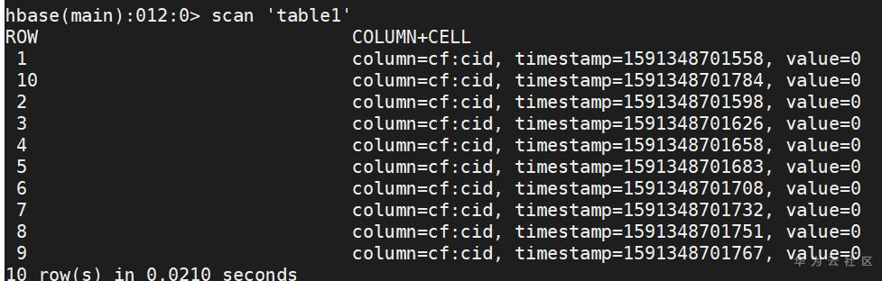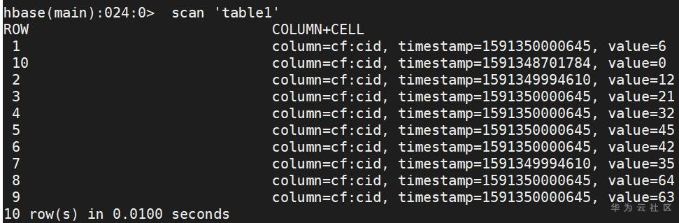 4. 在hbase下面查看表scan ”table1”,验证成功