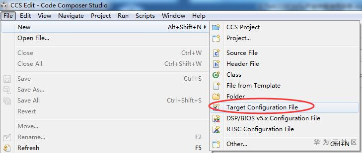 请先按照相关软件安装文档安装CCS,然后打开CCS集成开发环境,点击菜单"File->New->Target Configuration File",如下图所示: