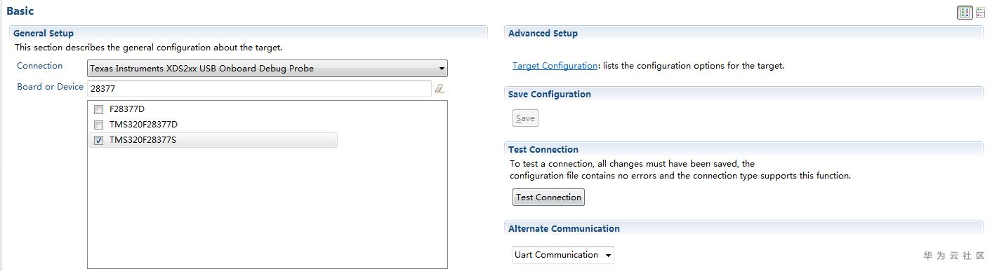 在弹出的对话框的"Connection"下拉框中选择对应的仿真器类型(如使用TL-XDS200仿真器请选择"Texas Instruments XDS2xx USB Onboard Debug Probe"),在"Board or Device"下拉框中选择对应的CPU型号:TMS320F2837xS,并点击保存。如果CPU是双核,请选择:TMS320F2837xD,如下图所示: