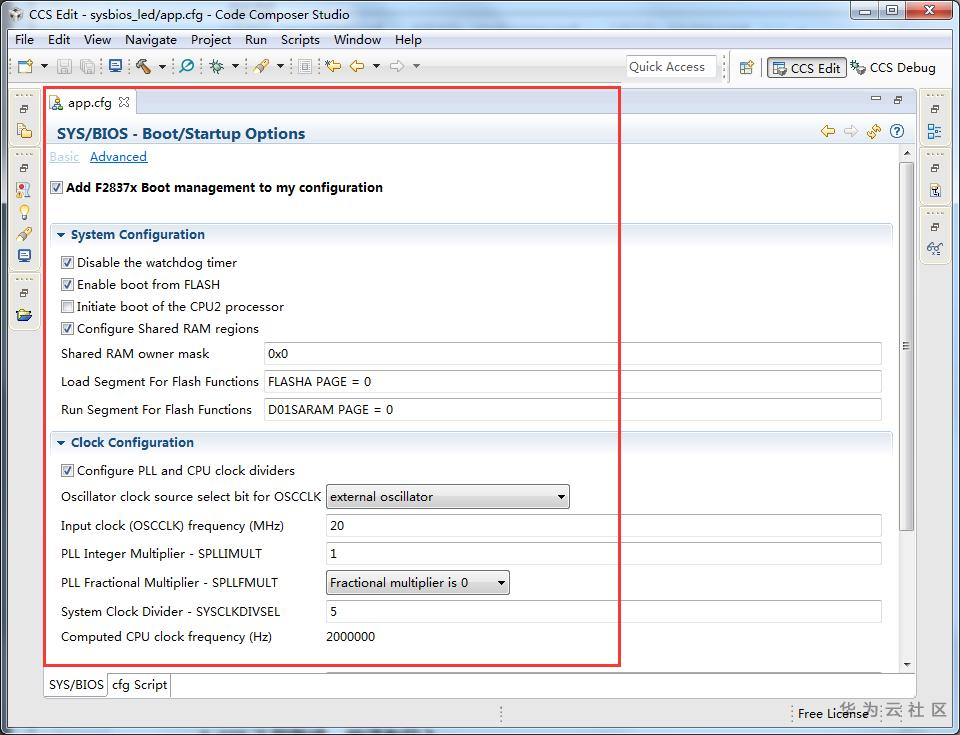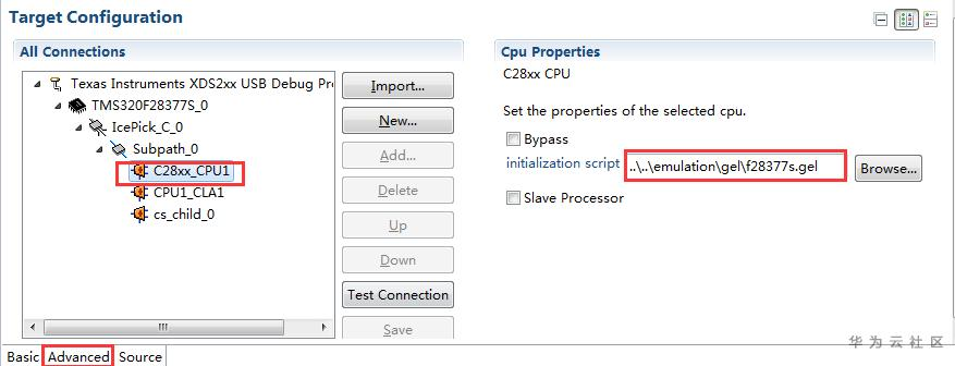 GEL文件主要用于在仿真调试的过程中对CPU进行初始化,如PLL、DDR等,还可以执行一些调试操作。CCS集成开发环境自带"f2837xs.gel"文件,为默认选项,可在Advanced界面配置。