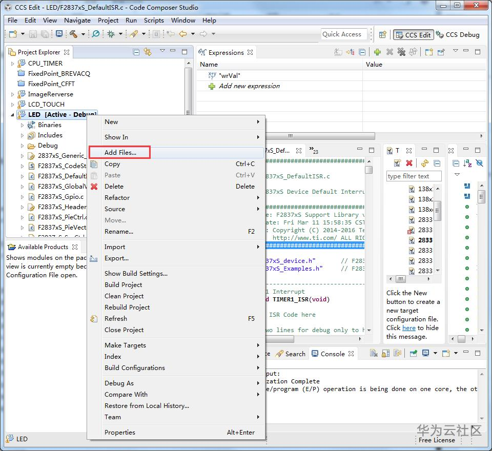 右键工程点击"Add Files…",在弹出的对话框中选到"2837xS_Generic_FLASH_lnk"文件,路径为光盘"Demo\F2837xS\NonOS\F2837xS_common\cmd"目录下。