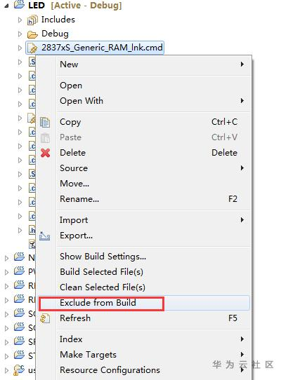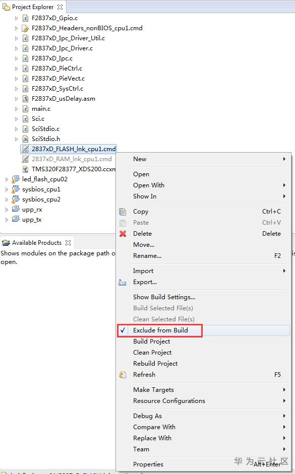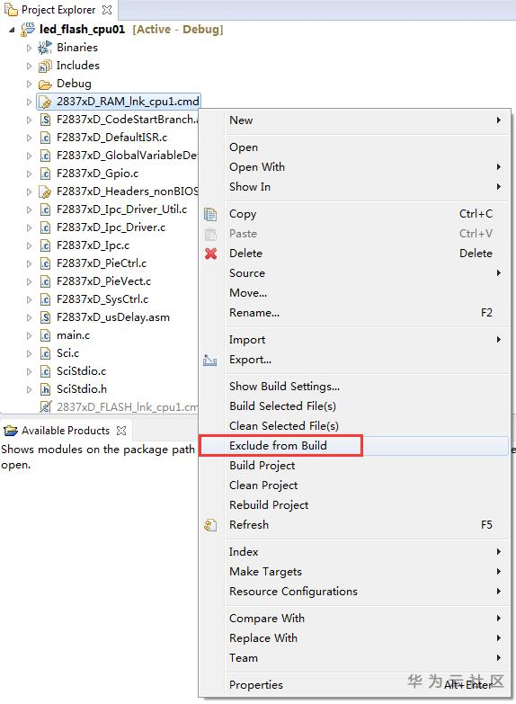 打开led_flash_cpu01的工程目录,右键点击"2837xD_RAM_lnk_cpu1.cmd",左键点击"Exclude from Build"选项。