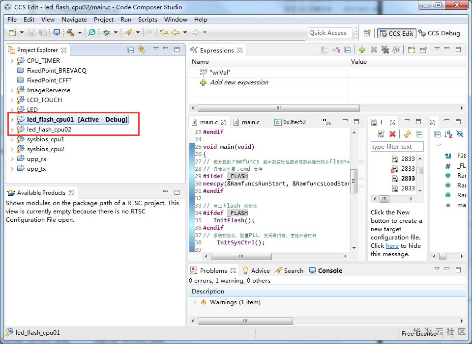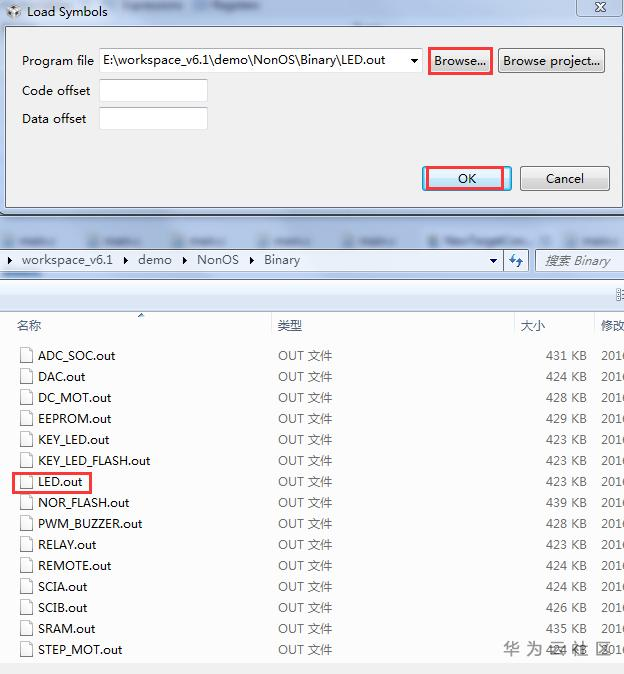 按照工程导入步骤,将生成的led_flash_cpu01.out和led_flash_cpu02.out文件,分别加载到CPU1和CPU2。