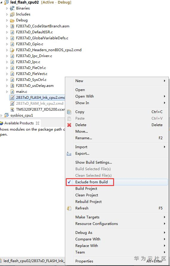 然后,在led_flash_cpu01的工程目录下,右键点击"2837xD_FLASH_lnk_cpu1.cmd",左键点击"Exclude from Build",取消该选项。