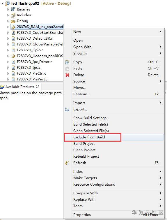 打开led_flash_cpu02的工程目录,右键点击"2837xD_RAM_lnk_cpu2.cmd",左键点击"Exclude from Build"选项。