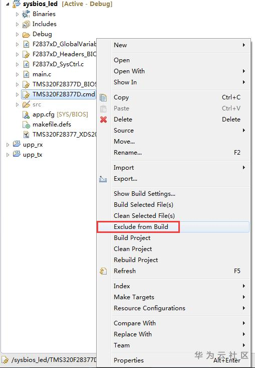 打开sysbios_led的工程目录,右键点击"TMS320F2837xD.cmd",左键点击"Exclude from Build"选项。