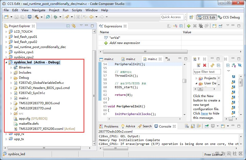 按照工程导入步骤加载sysbios_led.out文件,然后点击程序运行