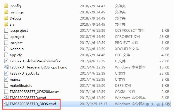 将光盘资料的Tools目录下的"TMS320F2837xD_BIOS.cmd"文件,拷贝到对应的工程目录下。