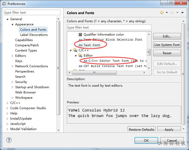 分别点击"General->Appearance->Colors and Fonts->Basic->Text Font"和"General->Appearance->Colors and Fonts->C/C++->EDITOR->C/C++ Editor Text Font",再点击"Edit…",在弹出的界面中选择12号常规"Yahei Consolas Hybrid"字体。
