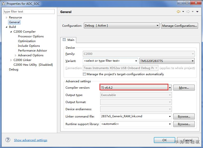 在弹出的对话框中选择"General->Compiler version-> TI v6.4.2",如下图所示: