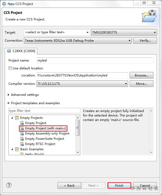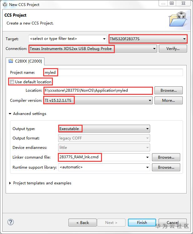 Project name:myled,CCS工程名字,称里面不能够包含非ASCII字符;